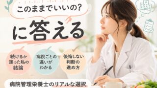 病院管理栄養士を続けるか迷う方へ。転職を考えた実体験をもとに、後悔しないための判断の進め方を解説。環境が合わないと感じたときの考え方や、病院ごとの違いの見抜き方、失敗しやすい転職パターン、正しい情報収集の順番までわかりやすくまとめています。今の働き方に違和感がある方はぜひ参考にしてください。